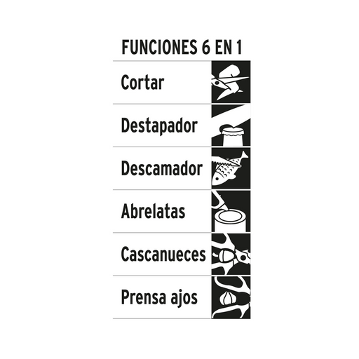 TRUPERAcerca de este Producto6 funciones en 1 (Cortar, destapador, descamador, abrelatas, cascanueces y prensa ajos)Hojas de acero inoxidable y mango erg...