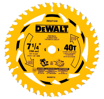 DEWALTAcerca de este ProductoAplicación: Madera.Diámetro: 7-1/4 pulg (184 mm).Eje: 5/8 pulg (16 mm).Máximas RPM: 7,000.Dientes: 40