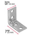 Pieza metálica en forma de "L", fabricada en acero galvanizado para ofrecer buena resistencia a la corrosión y durabilidad. Su diseño compacto incluye cuatro orificios distribuidos en ambas alas, lo que permite fijarla firmemente con tornillos a superficies de madera, metal o plástico. Cuenta con un refuerzo en la esquina para aumentar su rigidez y evitar deformaciones cuando se utiliza como soporte o unión estructural. Gracias a su tamaño reducido, es ideal para reforzar esquinas en muebles, cajones, repisas, marcos y diversos trabajos de carpintería o ensamblaje ligero.