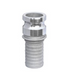 Acople rápido cam-&-groove tipo Parte E, fabricado en aluminio de alta resistencia. Se trata de un adaptador macho con vástago para manguera, diseñado para aplicaciones industriales como agricultura, riego, construcción, manejo de materiales y petróleo. Gracias a su aleación, el acople es ligero y tiene una excelente relación resistencia-peso, lo que facilita su manejo y montaje. Incluye manijas forjadas en bronce para accionar la leva, y su diseño incorpora clips de seguridad blindados para evitar desconexiones involuntarias durante operaciones con vibraciones o presión.Especificaciones