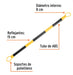 Se trata de una barra extensible reflectante de la marca Truper diseñada para usarse con conos de señalización o para delimitar áreas de tránsito, obras o eventos. Su longitud se ajusta desde 1.30?m hasta 2.10?m, permitiendo adaptarse a distintos espacios. Está fabricada con un tubo de ABS y soportes de polietileno, lo que le da ligereza y resistencia. Tiene un diámetro interno de 8?cm, incluye bandas reflectantes de 15?cm para alta visibilidad, y pesa aproximadamente 400?g. Esta barra es apta para uso de día y de noche gracias al material reflectante.Especificaciones