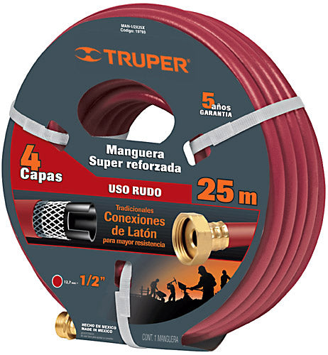 TRUPERAcerca de este ProductoMANGUERA PARA JARDIN 1/2", 25 M, SUPER REFORZADA, 4 CAPAS, CONEX. DE LATON, "PRO"