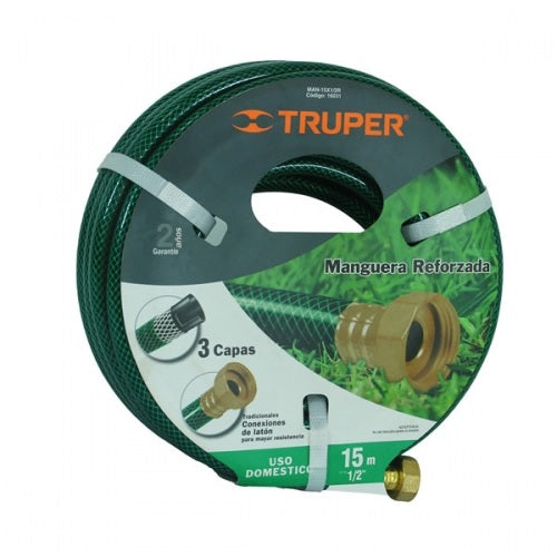 TRUPERAcerca de este ProductoMANGUERA PARA JARDIN 1/2", 15 M, REFORZADA, 3 CAPAS, CONEX. DE LATON, "CLASSIC"
