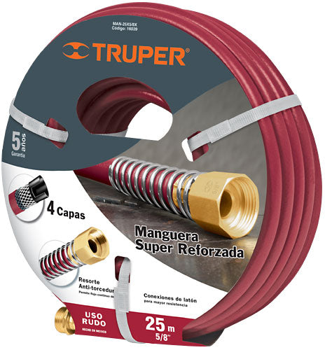 TRUPERAcerca de este ProductoMANGUERA PARA JARDIN 5/8", 25 M, REFORZADA, 4 CAPAS, CONEX. DE LATON, "PRO"