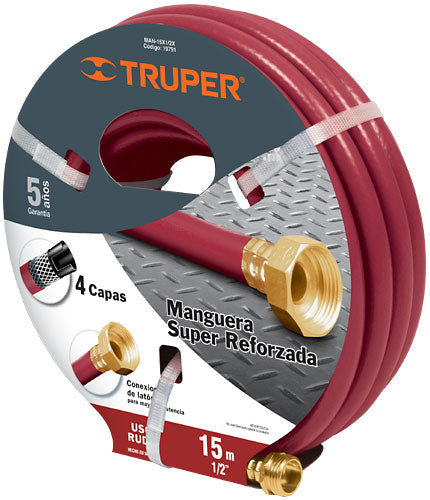 TRUPERAcerca de este ProductoMANGUERA PARA JARDIN 1/2", 15 M, SUPER REFORZADA, 4 CAPAS, CONEX. DE LATON, "PRO"