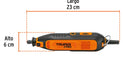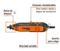 Ideal para trabajos de precisión como corte, lijado, pulido y grabado en materiales como metal, madera, plástico y cerámica. Viene equipada con un kit completo de 97 accesorios que incluye discos abrasivos, ruedas de fieltro, bandas de lija, brocas y fresas, lo que la hace muy versátil para uso en talleres, bricolaje y mantenimiento general. Su diseño ergonómico incluye un cable de 2.5 metros y un gancho para colgar, ofreciendo comodidad durante su uso. La herramienta es ligera, con un peso aproximado de 720 gramos, y está diseñada para un ciclo de trabajo recomendado de 30 minutos continuos por 15 minutos de descanso, evitando el uso intensivo prolongado.Especificaciones